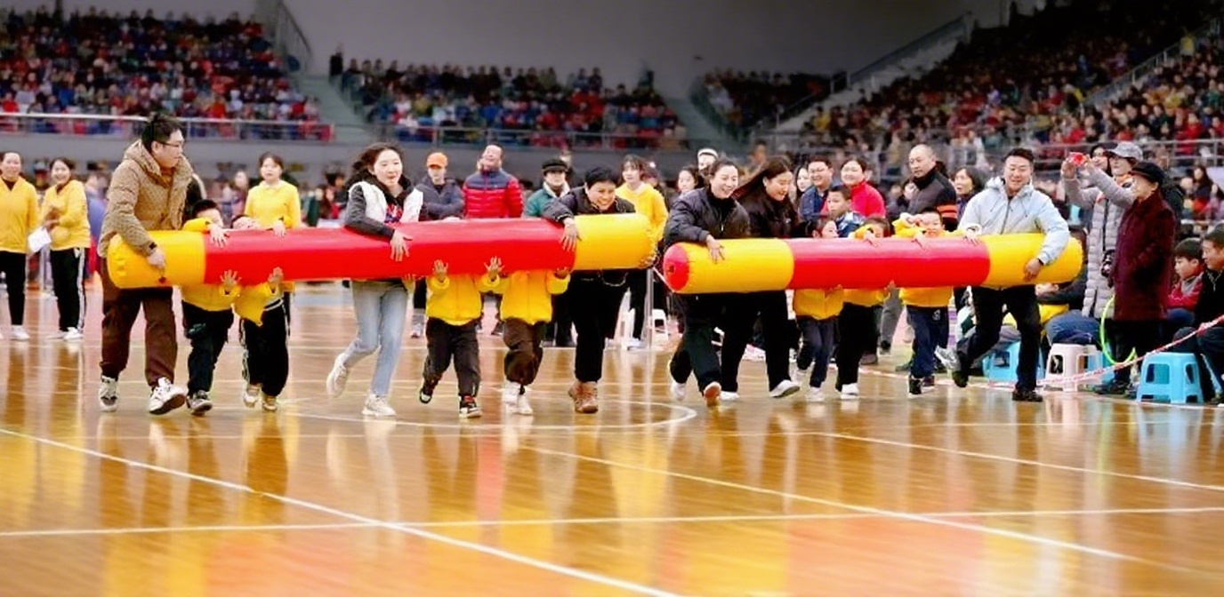 比赛时需 10-20 名队员按序站好,手持充气柱子从起点出发,到达终点或接力点换人后原路返回,以最后一名队员过终点计时结束,需全程协作确保行进规范。