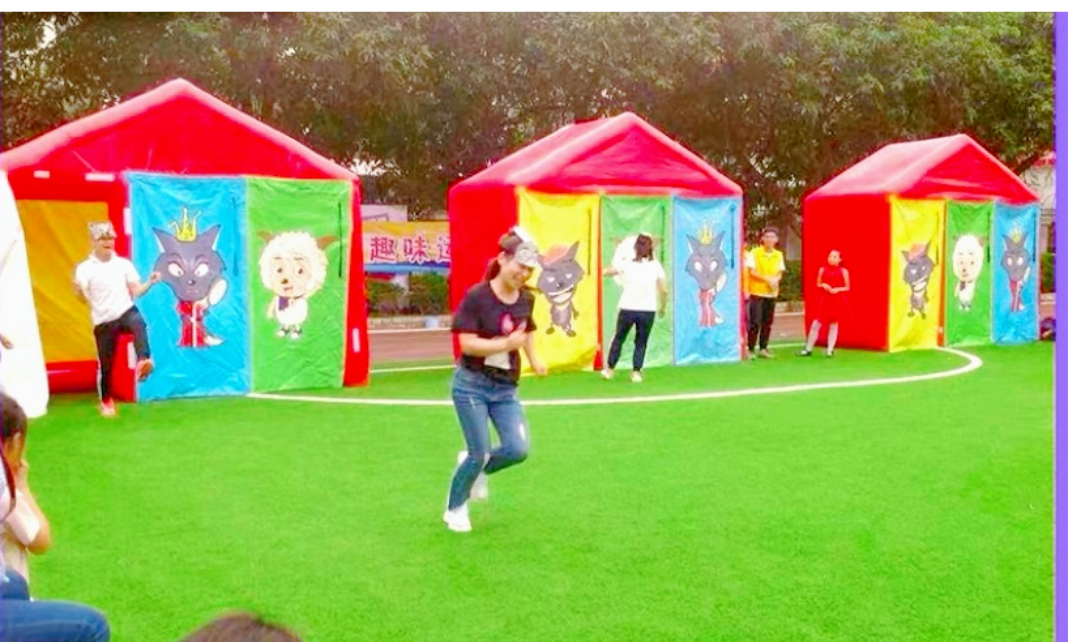 两个队伍互相PK(攻防角色),攻方每次派一名队员去掀开3个门帘(内有2兔1狼)的任意1个如里面是狼就跑(逃跑过程中被抓住扣1分),如是兔子就占领房子(得1分)最后汇总得分进行名次排列。