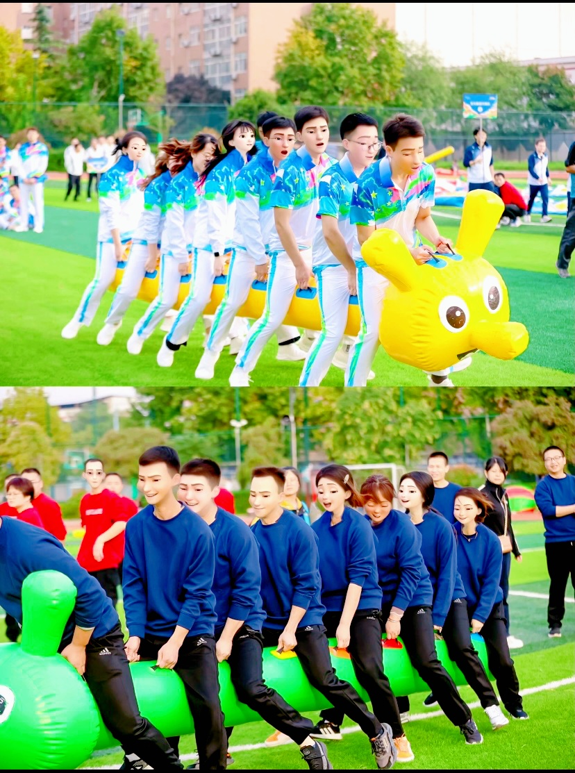 赛程为60米,6名队员骑在比赛器材上,双手把住固定把手立于起跑线后。裁判发令后,6名队员通过协调配合使比赛器材在跑道上行进,以各参赛队所用比赛器材触及终点及终点线所在垂直平面为计时停止,用时少者名次列前。