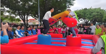 两队成员各派一名队员在在充气擂台气柱上,其余队员需在雷塔边上观战助威,裁判员发令后用过障碍棒互相推搡,将对方推下擂台柱获胜,可进行一局定胜负或三局二胜,最后统计全组人员胜的次数多为胜利。