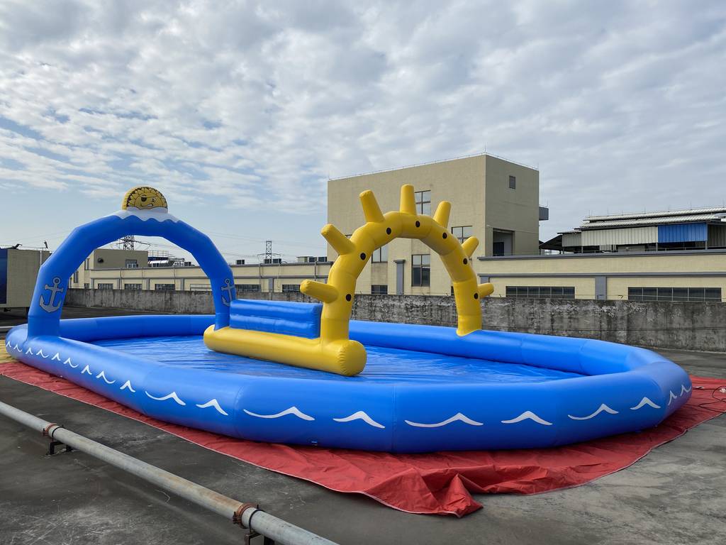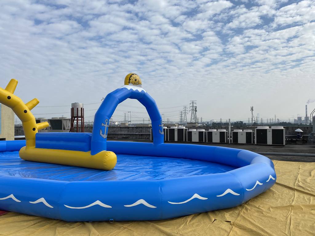 充气蓝黄游泳池,选用加厚环保 PVC,安全防漏、抗撕裂。造型童趣,集成太阳、拱门装饰,适配家庭、亲子营地等场景。快速充气即可打造嬉水空间,支持定制尺寸,为孩子开启安全有趣的水上欢乐时光 。