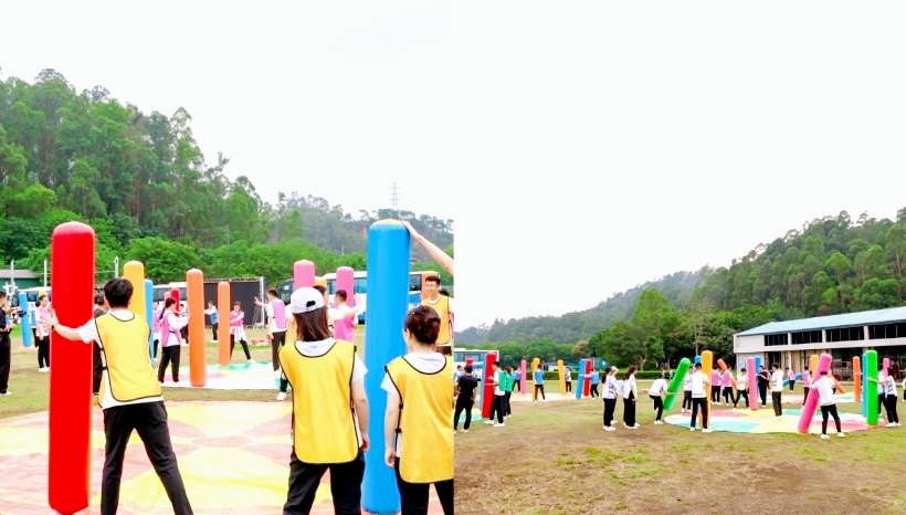 比赛以团队为单位参与,每队成员手持一根充气柱体站立成一列。比赛开始时,队员需同步松开手中柱体,迅速抓住前一位队员的柱体,在保持所有柱体不落地的前提下,以团队协作方式完成柱体转动。成功标准为:团队在柱体不掉地的情况下完成 10 次整体转动,或在限定时间内完成最多次数的柱体移动,移动次数最多的团队得分最高。