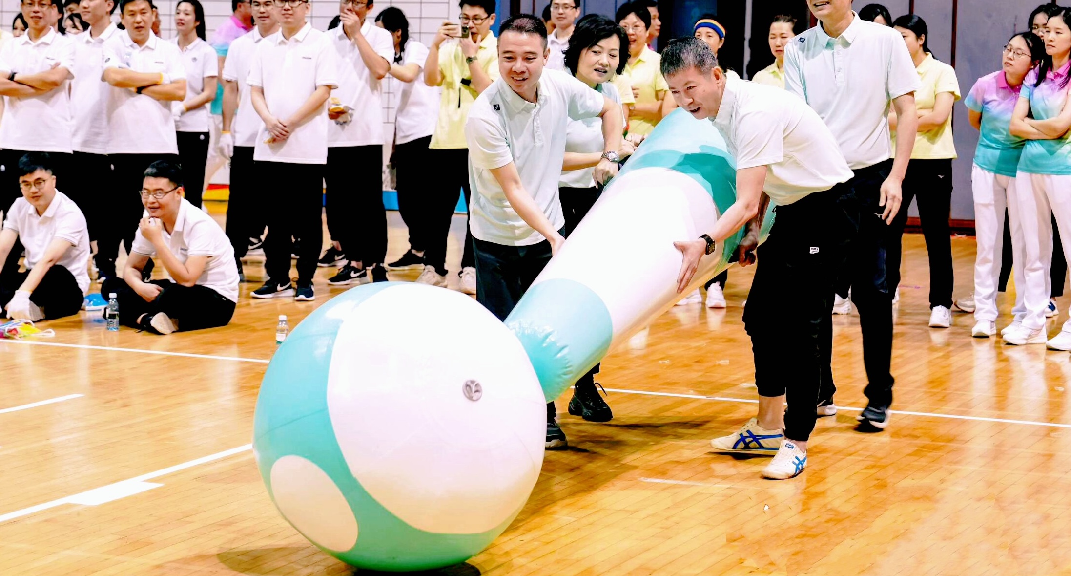 每队8名队员,分两组,每组4人在起点处抱柱子,裁判发令后通过团队协作一起用一个充气柱子将大球推动向前,抵达终点然后换下一个接力小分队,接力赛总用时最短的小组名次前列。