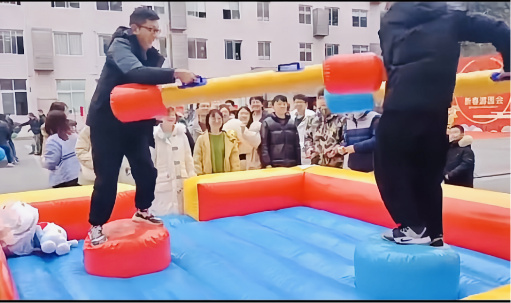 两队成员各派一名队员在在充气擂台气柱上,其余队员需在雷塔边上观战助威,裁判员发令后用过障碍棒互相推搡,将对方推下擂台柱获胜,可进行一局定胜负或三局二胜,最后统计全组人员胜的次数多为胜利。